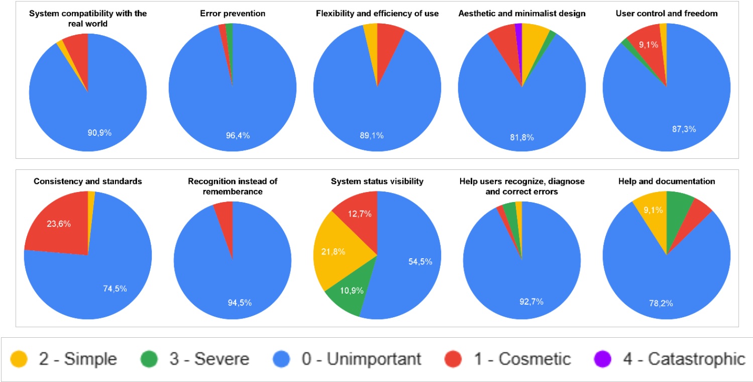 In all the heuristics, at least half of the errors were unimportant, and cosmetic errors were presented. We identified simple errors in 8 out of the 10 categories, serious errors in 6 categories, and catastrophic errors only in one category (Figure 1).